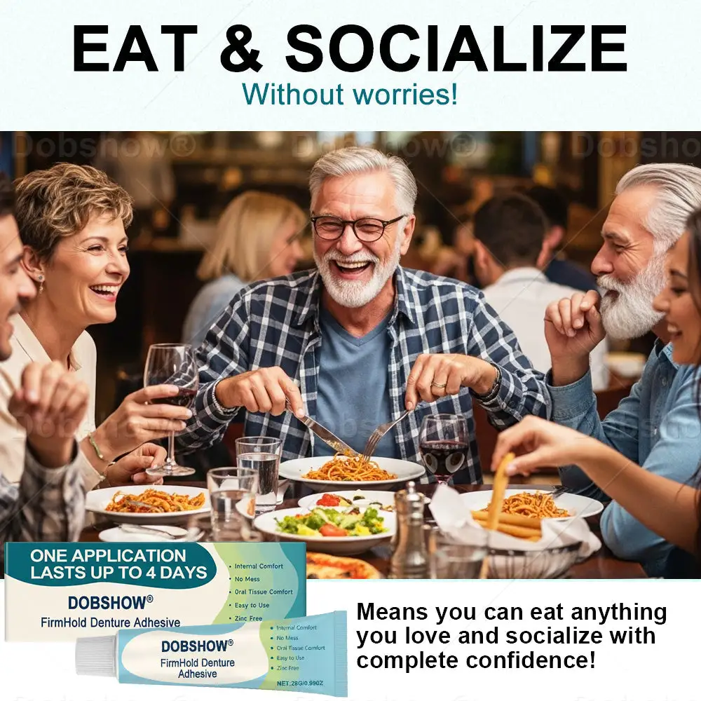 Unlike messy pastes or unreliable powders, Dobshow® FirmHold Denture Adhesive is waterproof, food-resistant, and lasts up to 4 days without needing reapplication. Whether you’re eating, speaking, or laughing, your dentures stay firmly in place, giving you worry-free confidence throughout the day.