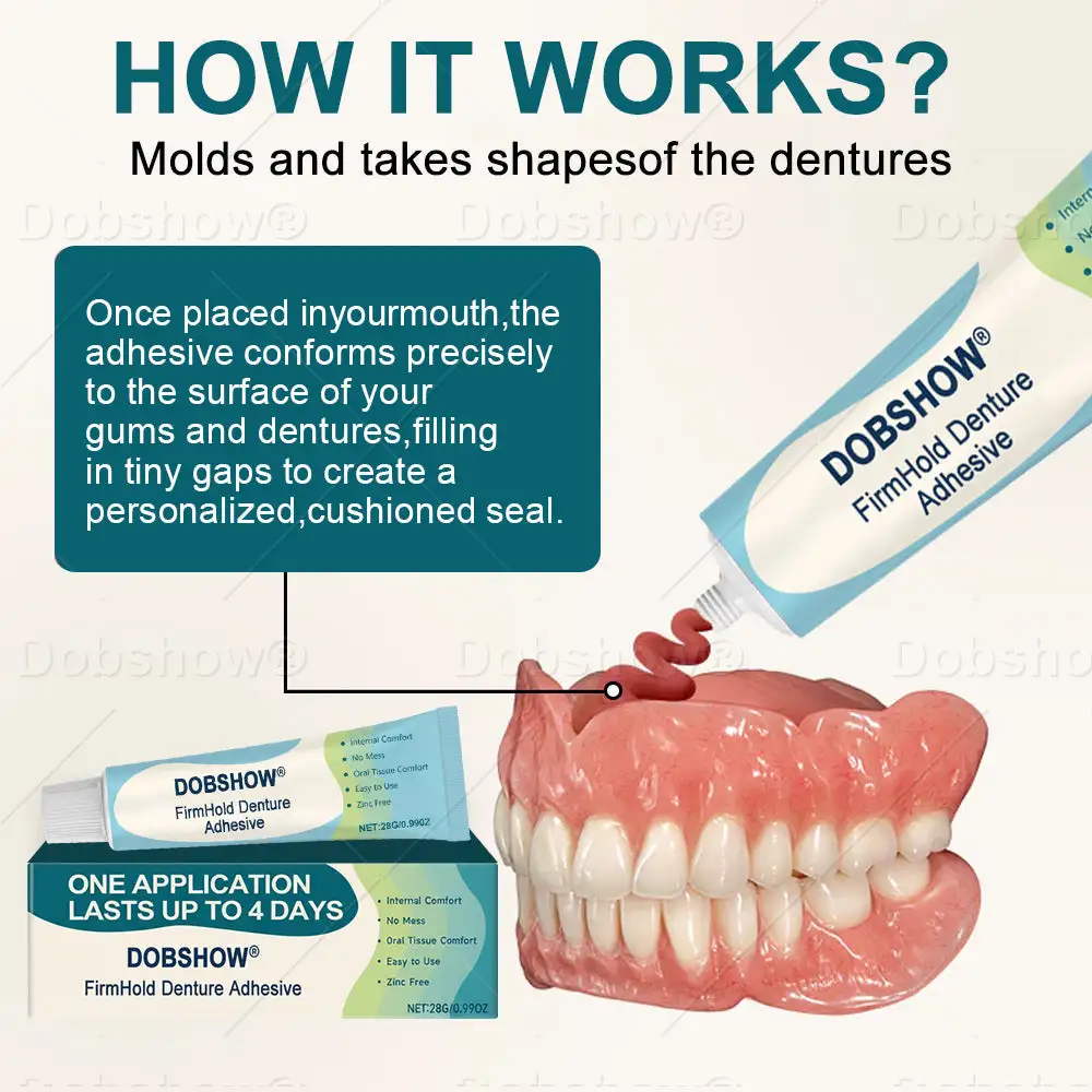 ✅ Waterproof and Mess-Free: Once set, the adhesive becomes completely waterproof and resistant to food particles, saliva, and heat. No sticky, pasty residue like gels or creams—Dobshow® keeps everything clean, fresh, and locked in place, even through hot meals and drinks.